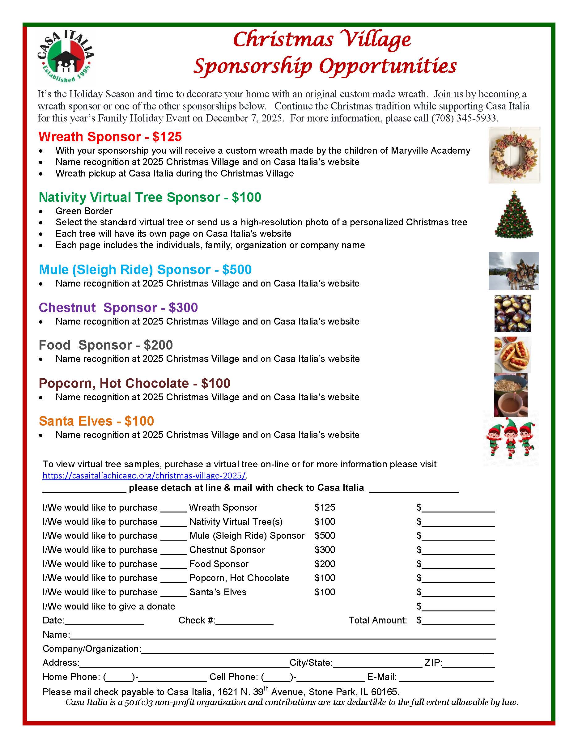| 12:30 – 5:30 p.m. | Mule-Drawn Sleigh/Carriage Ride In Front Of The Italian Cultural Center |