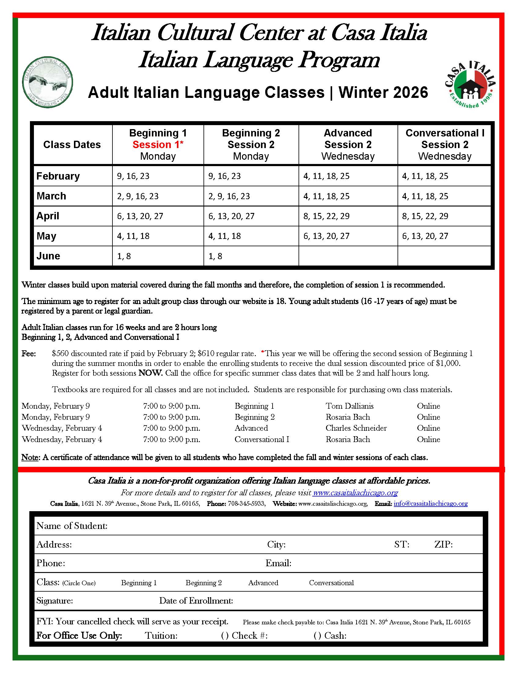 Register by Mail: Complete our online form and mail a check payment to Casa Italia, 1621 N. 39th Avenue, Stone Park, IL 60165