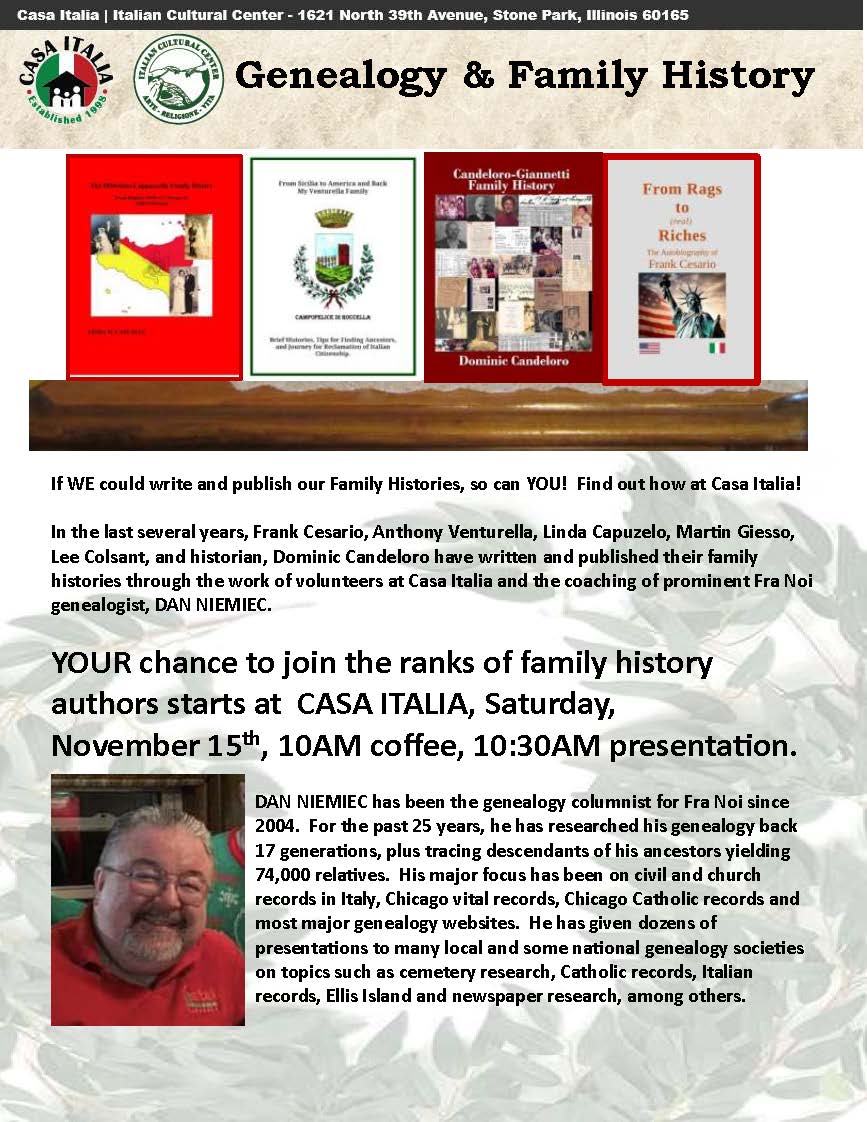 Nov. 22. Ricigliano Zoom panel- Maria Rosaria D’Alfonso with the mayor of Ricigliano and town historians to explore the origins of the first village-based mass migration to Chicago 1880-1960’s. |